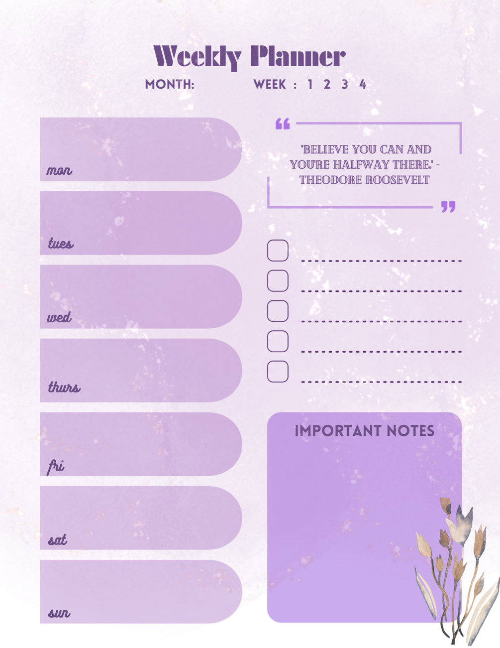 Your purple weekly planner is a compact and stylish organizational tool that helps you stay on top of your schedule. With its vibrant purple color, it adds a touch of personality to your everyday planning. It provides a clear and concise layout, allowing you to easily view your weekly appointments, tasks, and goals.